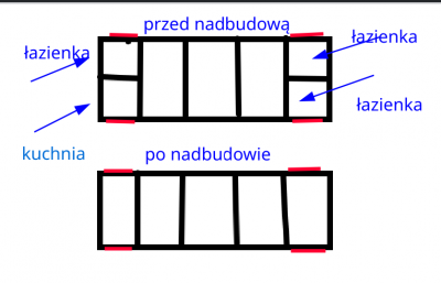 Murarze nadbudowali mi komin o dodatkowe 1,5m w związku z podwyższeniem dachu. Przed przebudową wysokość całego komina od podłogi parteru było około 10,5m Wczoraj zauważyłem, że murarze nie zachowali podziału kanałów wentylacyjnych w nabudowanej części, połączyli kanały jak na złączonym rysunku (zrzut z góry komina), dodatkowo zaznaczyłem na czerwono, gdzie znajdowały się i znajdują kratki na ściankach w kominie. Kuchnia i łazienka od lewej na rysunku są na parterze, zaś po prawej jedna łazienka jest na piętrze druga na drugim piętrze.
