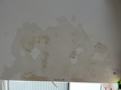 Niedawno kupiłem mieszkanie i po jakimś czasie okazało się, że przy oknie w kuchni ze ściany zaczyna pryszczeć farba. Po zeskrobaniu farby okazało się, że ściana jest mokra, więc zeskrobałem również mokrą gładź, aby zobaczyć czy ściana wyschnie. Ściana po paru tygodniach przesłucha więc nałożyłem nową gładź i pomalowałem ścianę.