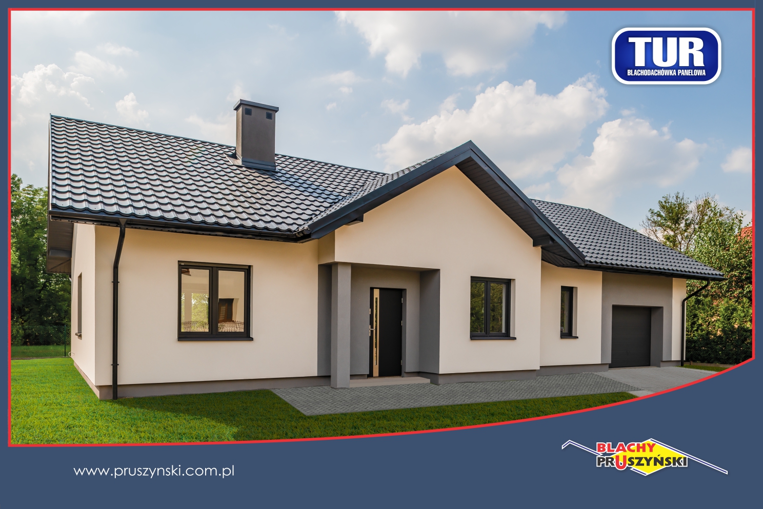 Blachodachówka TUR Blachy Pruszyński wyróżnia się wyrazistym i nieco surowym kształtem. Dostępna jest w postaci jedno- i dwumodułowych paneli.