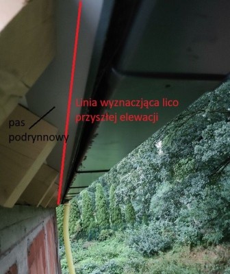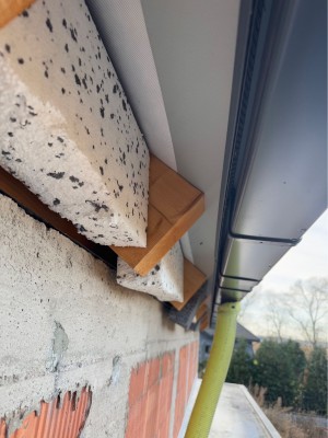 Przy robieniu elewacji jako że cały okap wystaje na około 23 cm musimy teraz dojechać styropianem bezpośrednio pod widoczną na zdjęciach membranę oraz blachę pasa podrynnowego (na gotowo zewnętrzne lico elewacji będzie odsunięte około 1,5-2 cm od widocznego na zdjęciach zagiętego kapinosa pasa podrynnowego - tak aby ewentualne nieduże ilość wody/wilgoci spływające z membrany dachowej a następnie pasem podrynnowym nie powodowały zacieków na elewacji oraz tak aby całe krokwie ukryły się w styropianie), a następnie połączyć się styropianem do tej blachy za pomocą taśmy rozprężnej/ uszczelniającej lub pianki. Tak więc styropian dojdzie bezpośrednio do blachy pasa podrynnowego.