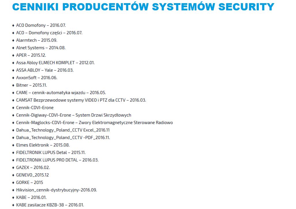 Żadnego cennika, żadnych promocji... nie nie znaczy są ale weź mi znajdź ile kosztuje najtańsza kamera AHD 2000 tvl: Każdy link to 1 pdf. więc szukaj se Pan se Pan znajdzie to my sprzedamy. Wolę ceneoo tam mam wyplutą cenę a nie cennik wszystkiego i niczego.