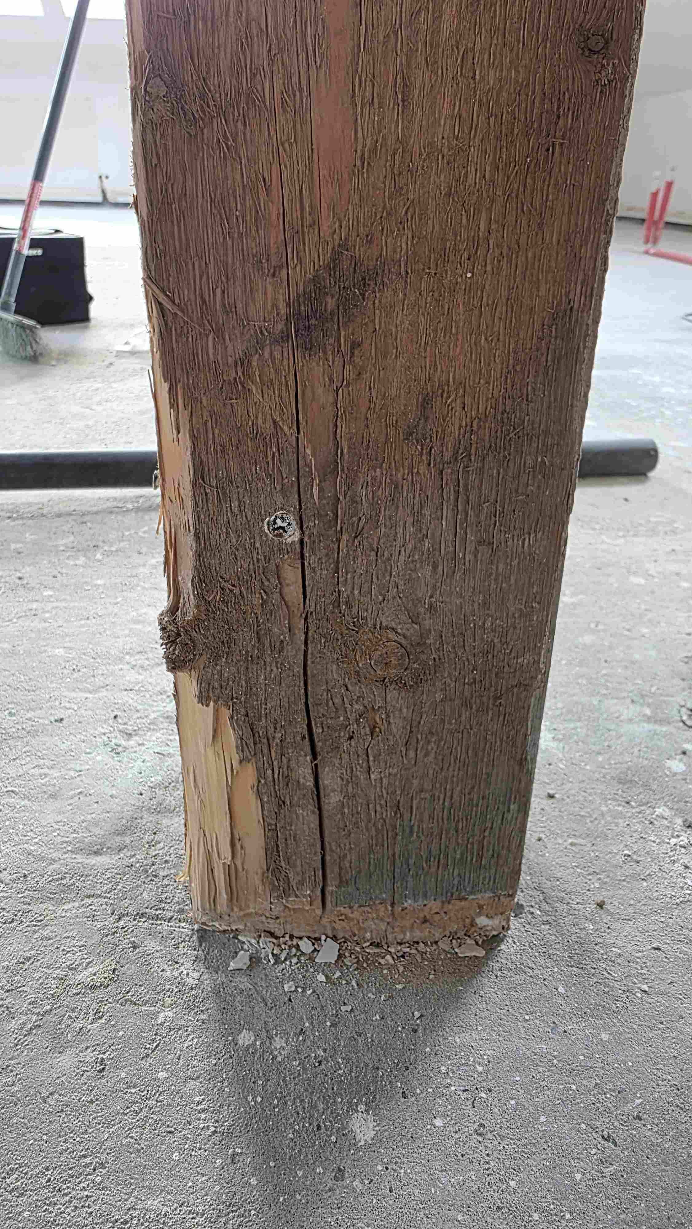 Robię generalny remont poddasza i jeśli coś jest do naprawy to teraz jest czas kiedy należy to zrobić. Słupy generalnie w dobrym stanie od 20 lat stoją mimo tego że część bez podparcia deską ani nawet bez izolacji od betonu natomiast jeden budzi umiarkowany niepokój jak na zdjęciach. Złuszczył się i nie wiem czy to przez to że nie ma deski a beton wyjątkowo nierówny czy to już jakaś degradacja materiału. Zdjąłem luźne fragmenty i zostało jak na zdjęciach, pewnie po centymetr mniej z dwóch stron ze słupa 13x13 pierwotnie. Drrwno suche nie ma zapachu. Myślę czy po prostu nie zainpregnować i nie zostawić jak jest czy nie wymienić chociaż to już poważną ingerencja. Reszta słupów jest ok. Z drugiej strony po oddaniu wylewki i gk to już po ptokach. Proszę o porady.