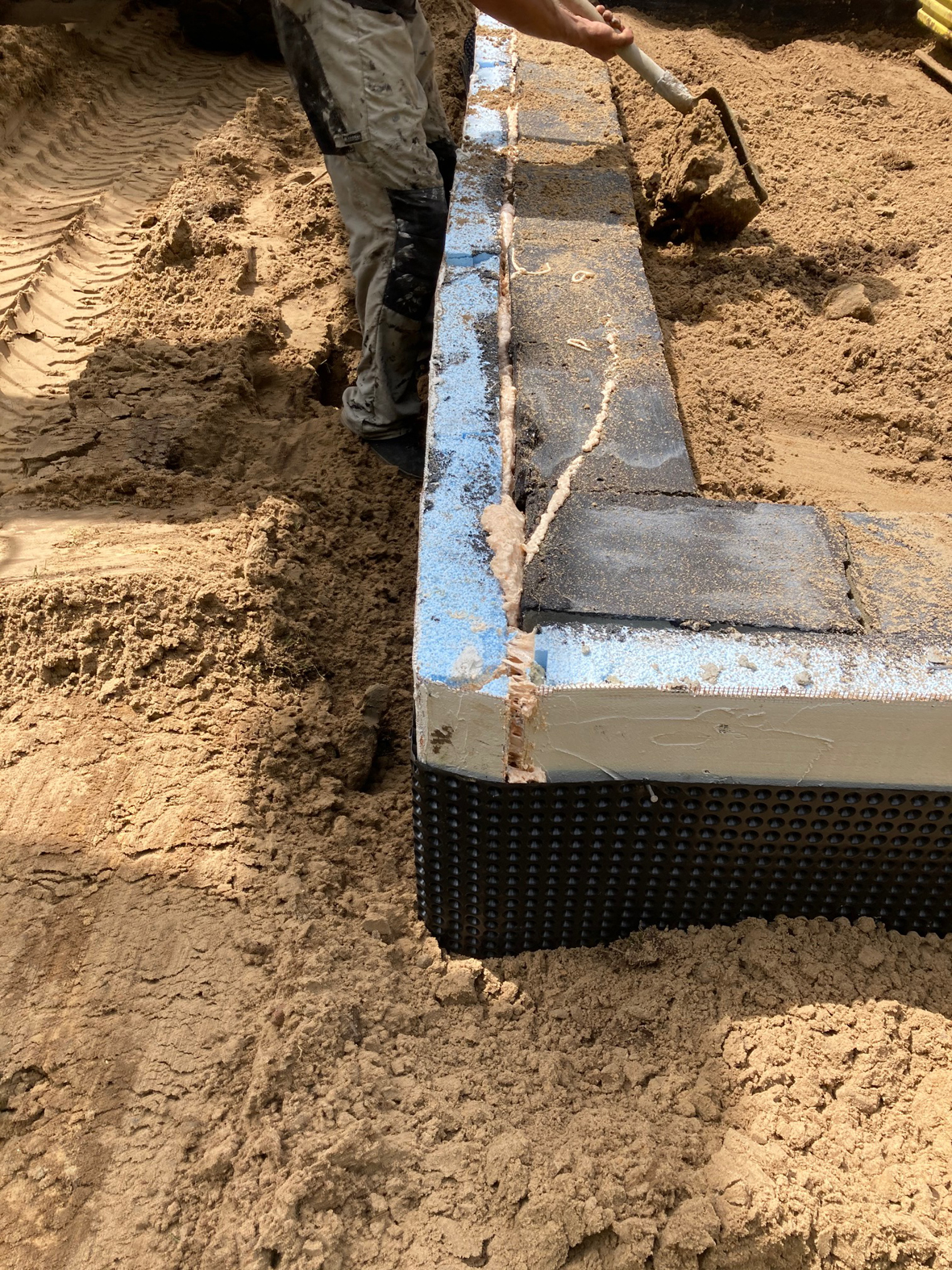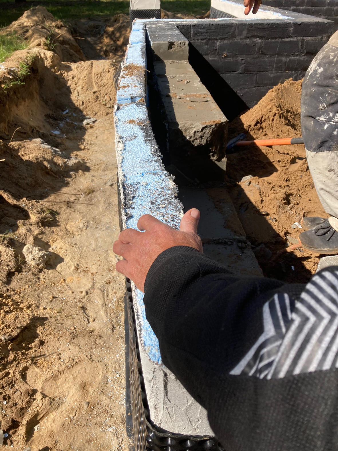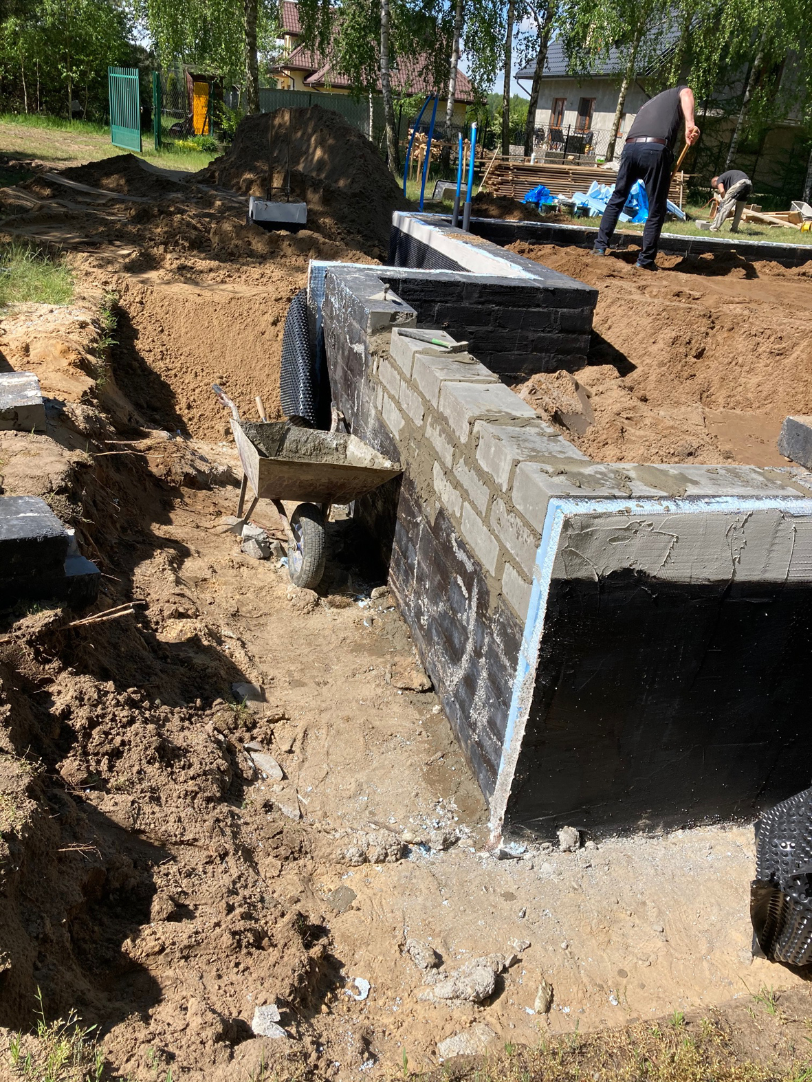 Bloczki fundamentowe ekipa stawiała 17.05.2021, tydzień później 24.05 przyjechała koparka zasypywać fundamenty, niestety podczas machania łyżką, uderzył w jedną ze ścian, trzy warstwy bloczków od góry zostały przesunięte w narożniku, więc tak naprawdę dwie ściany fundamentowe zostały uszkodzone.