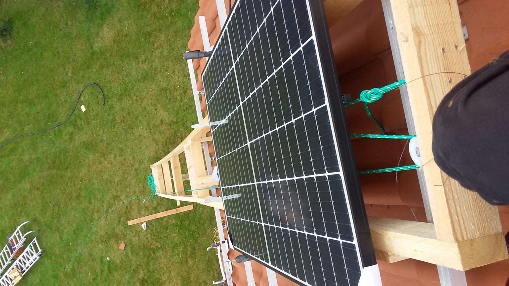 Ja miałem trudne warunki bo duża wysokość, nieregularna połać dachu i dwie własne ręce. Więc zrobiłem ze sztachet specjalną klatkę uwiązaną na grubym sznurze do której wkładałem panele pojedynczo i następnie wciągałem je najpierw na rusztowanie a potem na dach.