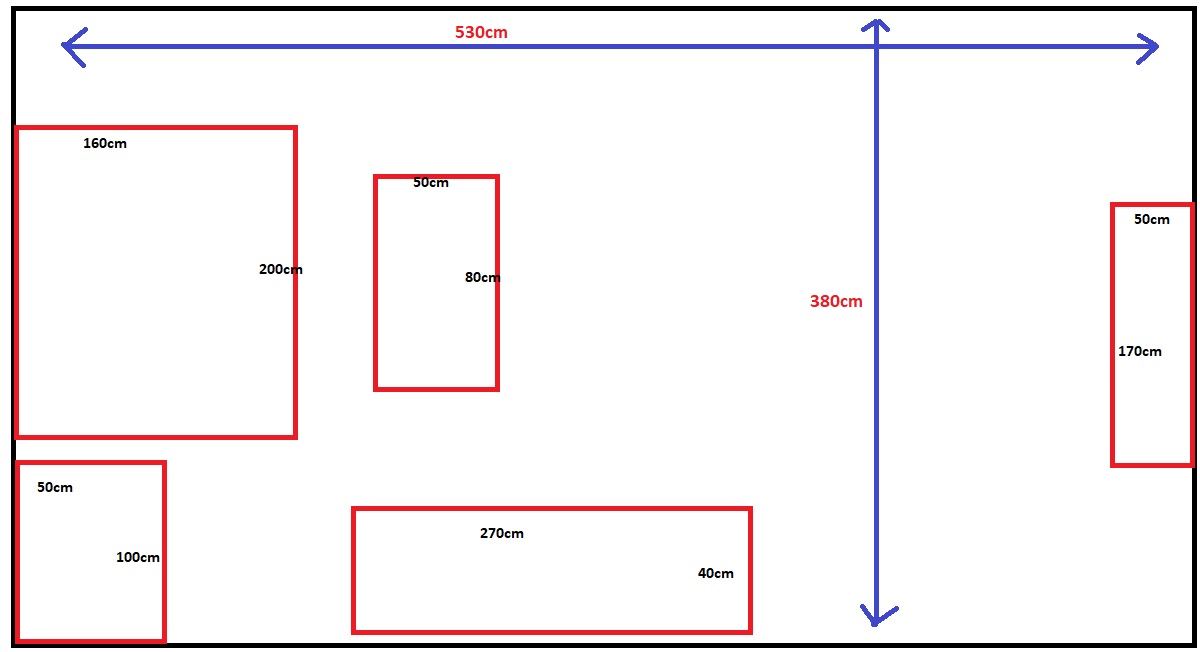 Na rysunku przedstawiłem jak wygląda rozłożenie mebli i jaką powierzchnie zajmują.