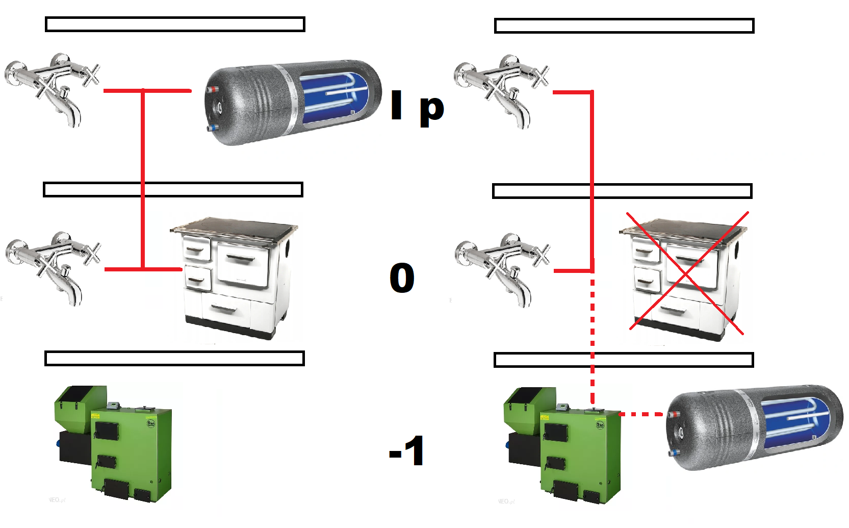 Ze względu na znaczne zużycie starego bojlera, liczne przecieki łatane blachowkrętami, przyszedł czas na jego wymianę. Obecnie ciepła woda ogrzewana przy pomocy kuchni węglowej (strona lewa na grafice). Ze względu na zakres prac i czas nie jestem w stanie wykonać tego samemu. Chodzi o montaż bojlera wody 150l, podłączenia go do kotła wodnego stalowego typu KWMP2 przy pomocy rur CU wraz z niezbędnymi zaworami oraz uzupełnienia brakującej instalacji (linia przerywana) dla ciepłej wody użytkowej przy pomocy rur PP. Zakup niezbędnych materiałów możliwy po stronie klienta.