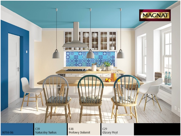 A może coś w tym stylu? Jest retro, jasno i lekko. Pachnie trochę Prowansją też. Zwróć uwagę a nietypowy, niebieski sufit. :)