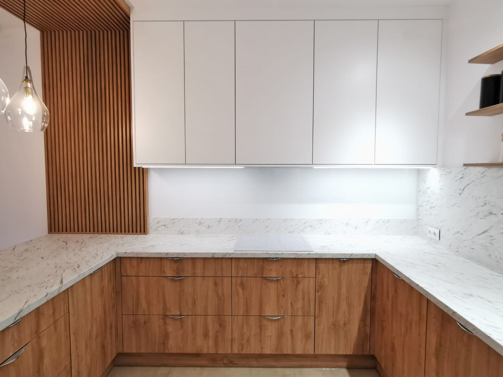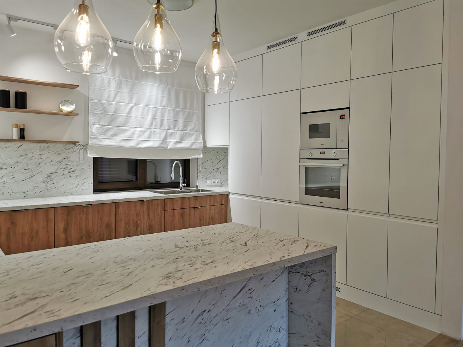 Całość uzupełniają nowoczesne urządzenia kuchenne oraz stylowe dodatki, które tworzą spójną estetykę. Kuchnia z frontami białymi, drewnopodobnymi detalami i blatem imitującym marmur to idealne miejsce do gotowania, spędzania czasu z rodziną i przyjmowania gości. Jest to wnętrze, które zachwyca swoim wyglądem i funkcjonalnością.