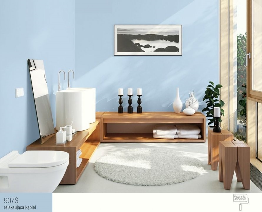 Niebieski kolor daje poczucie świeżości, błogości i może powiększać wnętrze. Jest teraz bardzo modny i w zestawieniu z bielą urządzeń sanitarnych wygląda bardzo elegancko.