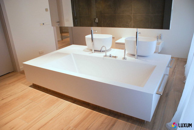 Wyposażenie luksusowych łazienek wytwarzane są z nowoczesnych i tradycyjnych materiałów, takich jak kompozyty solid surface Krion, Corian, Staron, GFK Luxum, Montelli czy nawet włókno węglowe ( carbon ) oraz szkło, stal, beton architektoniczny, drewno teakowe czy panele drewniane frezowane 3d, kamień naturalny itp.
