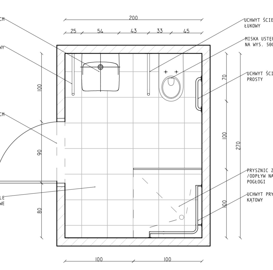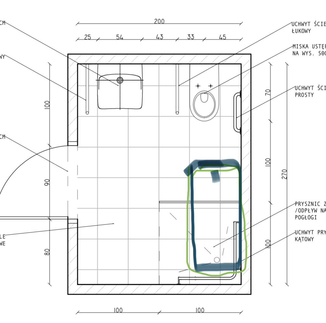 Witajcie! Robię remont łazienki w bloku z wielkiej płyty. Łazienka będzie dostosowana do potrzeb osoby niepełnosprawnej. Moje pytanie dotyczy prysznica z odpływem liniowym- czy jest narysowany w dobrym miejscu? Wykonawca upiera się, że prysznic powinien być tam gdzie jest narysowana umywalka.