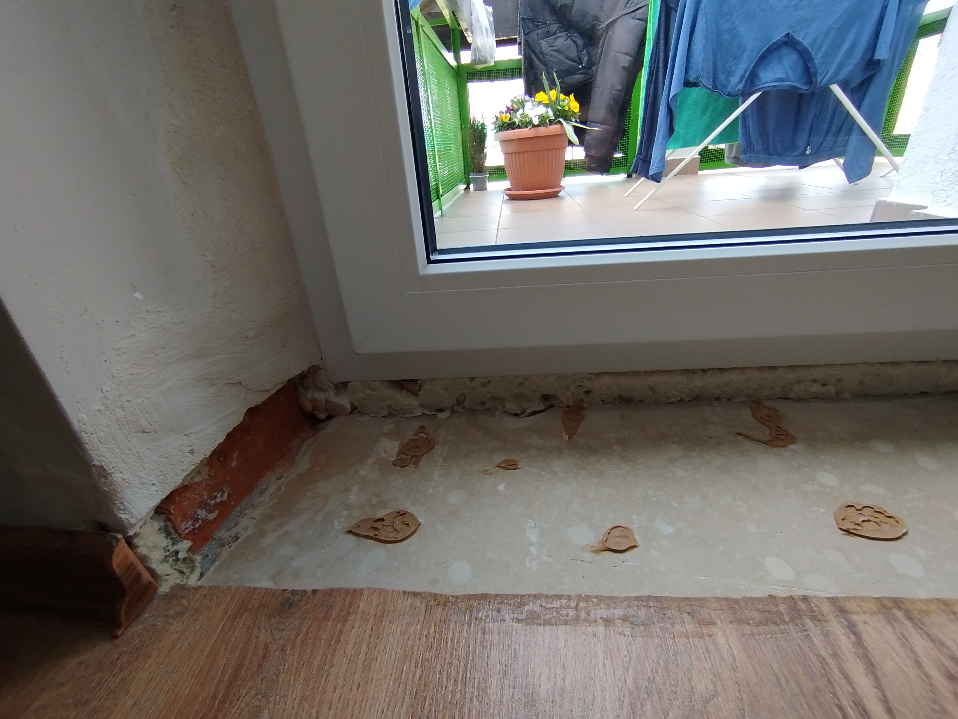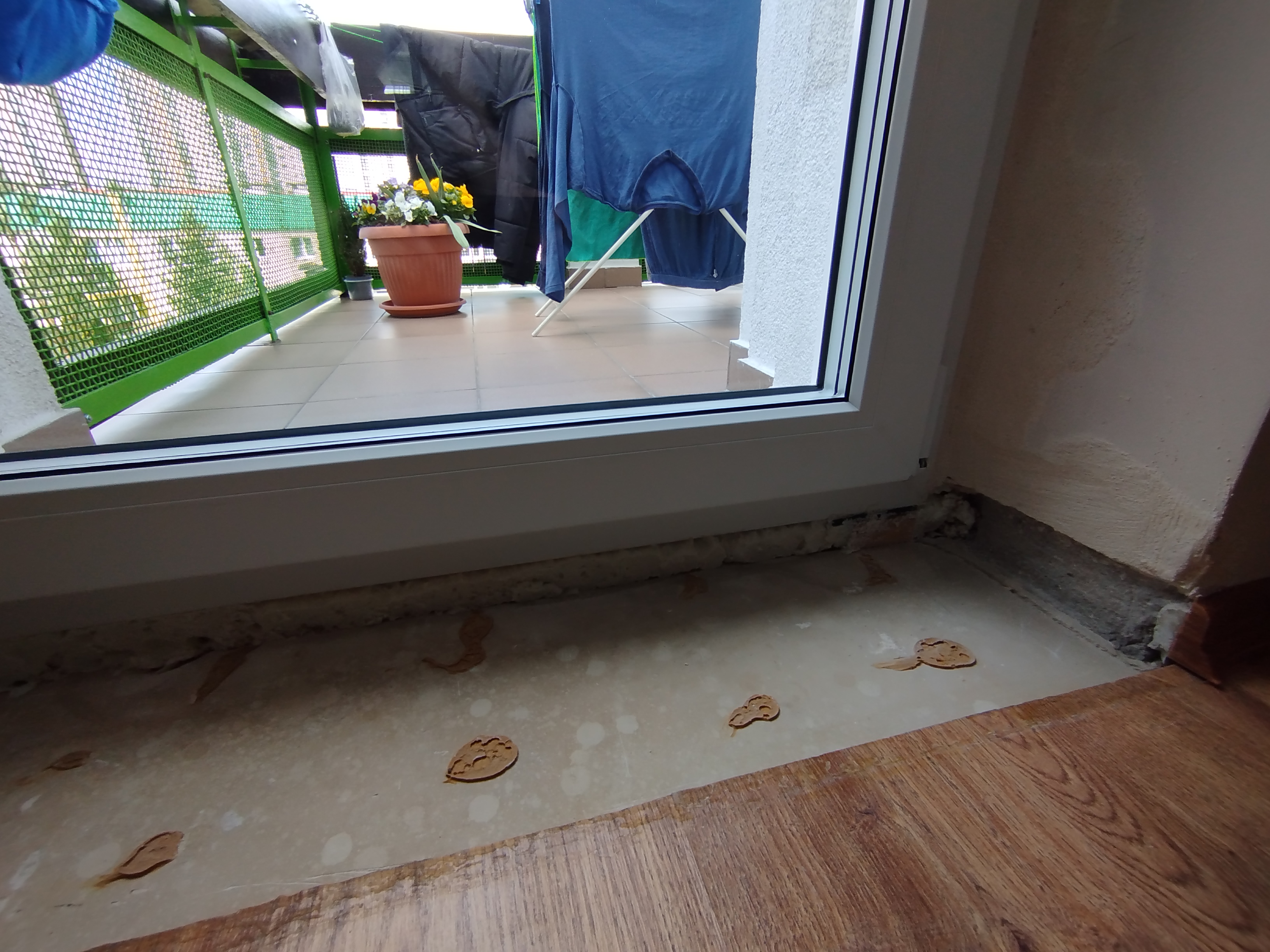 podczas montażu nowych okien i drzwi balkonowych został zdemontowany drewniany parapet (próg). Próg został podcięty z racji grubszej nowej ramy okiennej. Jak widać na foto próg był klejony do wylewki, w narożnikach była pewnie pianka uszczelniająca. Pod ramą okienną jest pianka, czy to izolacyjnie wystarczy do prawidłowego montażu progu, czy też muszę tutaj dodać jakaś chemię uszczelniającą, czy zaprawę tak by to to było prawidłowo zrobione?
