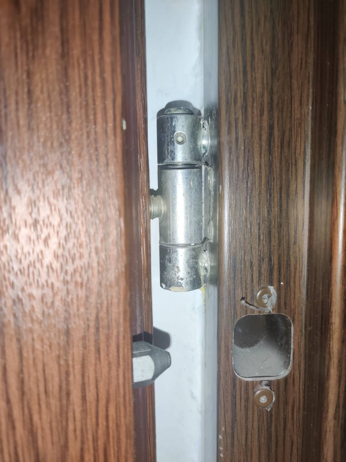 Na zdjęciu widoczna szczelina oraz 3 zawiasy - 2 zawiasy na wysokości około 1.5m oraz 1 zawias ok 30-40cm względem wysokości podłogi.