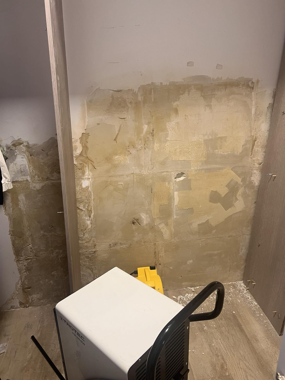 Cześć, zalało mi mieszkanie. W zasadzie to najprawdopodobniej zalewało się stopniowo przez 4 lata odkąd je kupiłem. Blok robyg z 2018 roku. Problem zauważyłem w momencie pęknięcia drzwi przesuwnych prysznicowych i rozwarstwieniu się płytek. Po lokalizacji źródła przecieku przez firmę okazało się, ze problemem był odpływ liniowy . W związku z tym ze w mieszkaniu mam położone panele winylowe nic nie napęczniało . Mieszkanie jest po ok 4 tygodniach suszenia i o ile lazianka, podłoga wyschła tak mam problem z jedną scianą w garderobie na której stała zabudowa meblowa około 2na2m od dołu od podłogi, góra jest sucha. Ta sciana po drugiej stronie znajduje sie w łazience. Wilgotność praktycznie nie spadła. Po zdarciu tynku ma ona kolor taki rdzawo oliwkowy.