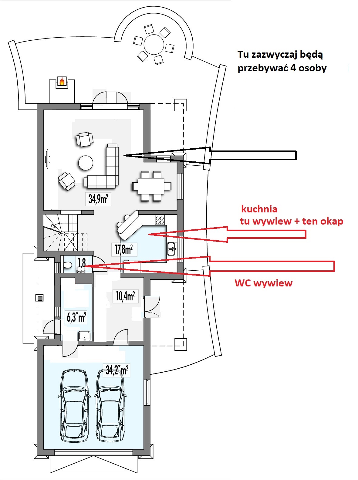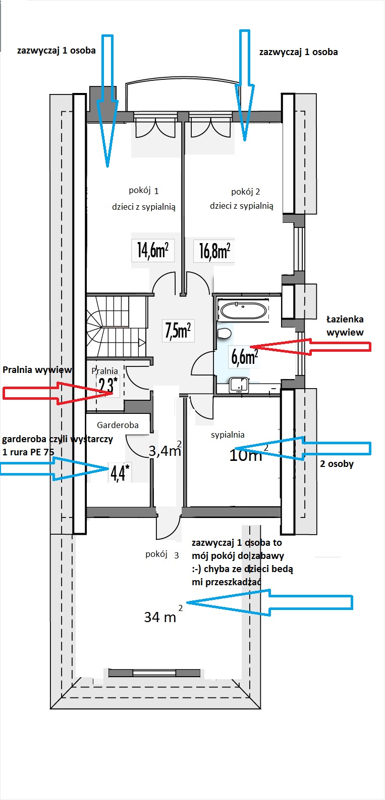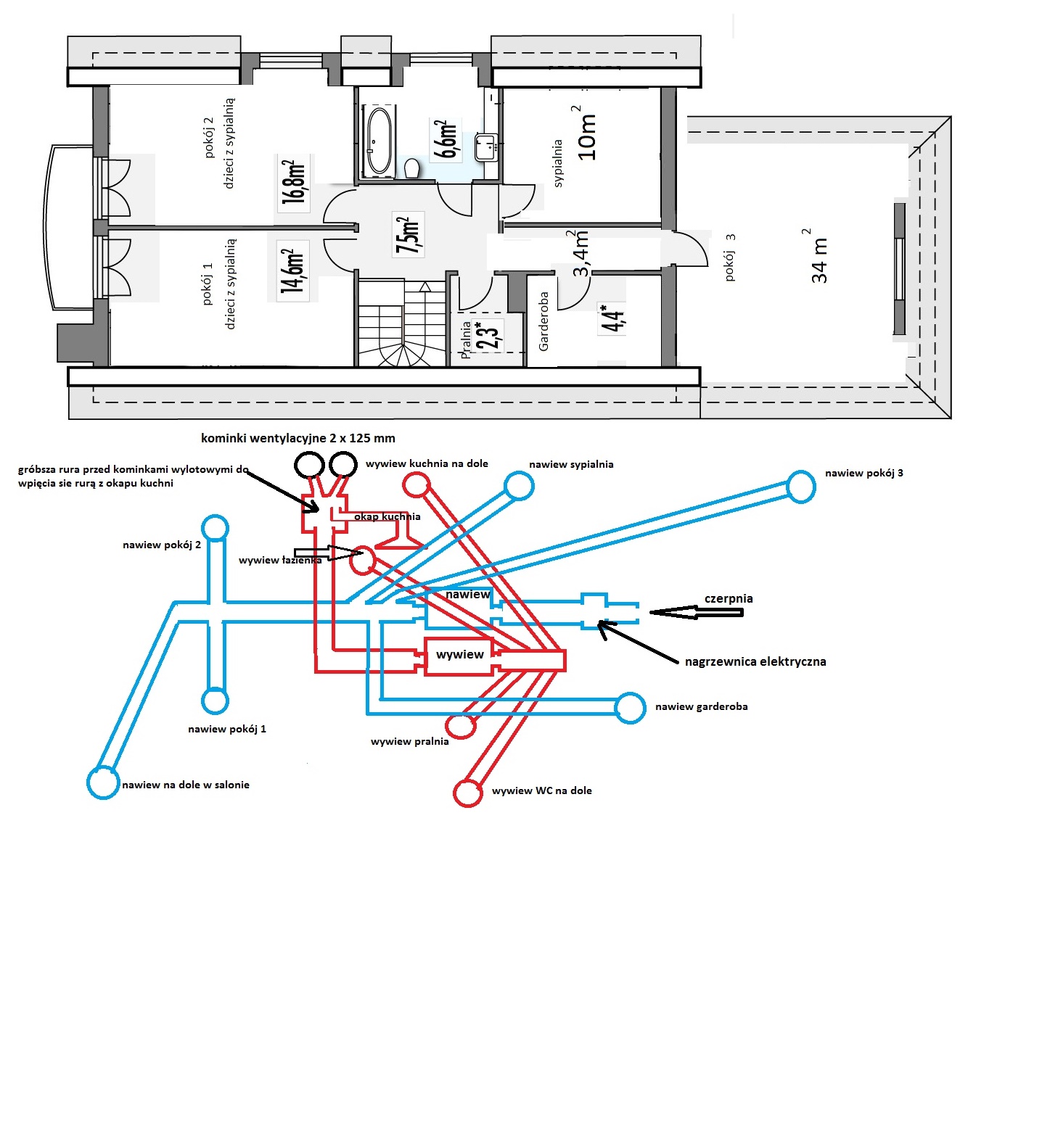 Kanał PE75 ma fi n63mm i przy 2m/sek ma 22m3/h. Ilość kanałów PE jest związana z wyjściem z centrali, czyli najpierw centrala potem rozdzielaczwak pisze:Kanał PE75 ma średnicę 75 mm, czyli przekrój 4400 mm2. Zakładając, że maksymalna prędkość powietrza w kanale to 2 m/s, przez sekundę przejdzie przez niego 2 m/s * 4400 mm2 = 0,0088 m3/s powietrza, a przez godzinę 3600 s * 0,0088 m3/s = 31 m3 powietrza