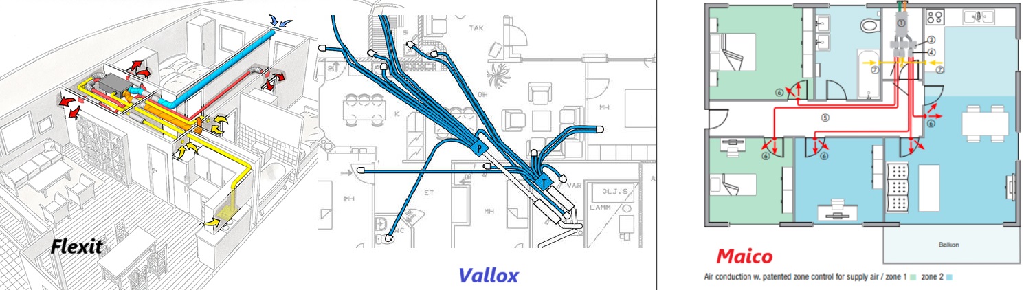 Centrale nie hałasują, szumy generuje instalacja. Najprawdopodobniej nawiew jest na całą kubaturę a nie tam gdzie aktualnie są ludzie. Wentylacja powinna być dla ludzi, ogrzewanie i chłodzenie dla kubatury. Ta centrala jest dla 8-9 osób. Jeżeli osób jest mniej, to poza tym, że nocą jest słyszalna wentylacja, powietrze zimą jest przesuszane, a zużycie na ogrzewanie przekracza i to wielokrotnie 15kWh/m2 rocznie ( górna granica dla instalacji HVAC z poprawnie wykonaną wentylacją). Poza tym, że centrala jest na 8-9 osób (minimum 225m3/h ) to zapewne instalator, by zarobić jak najwięcej, dał zbyt dużo i zbyt długich kanałów (nawiew powinien być naprzeciwko okna) Na grafice przykładowe instalacje Flexit, Vallox czy Maico - proste i krótkie kanały, by opory były małe, by nie "męczyć" wentylatory, bo szybko się zużywają i będą coraz głośniejsze.